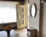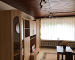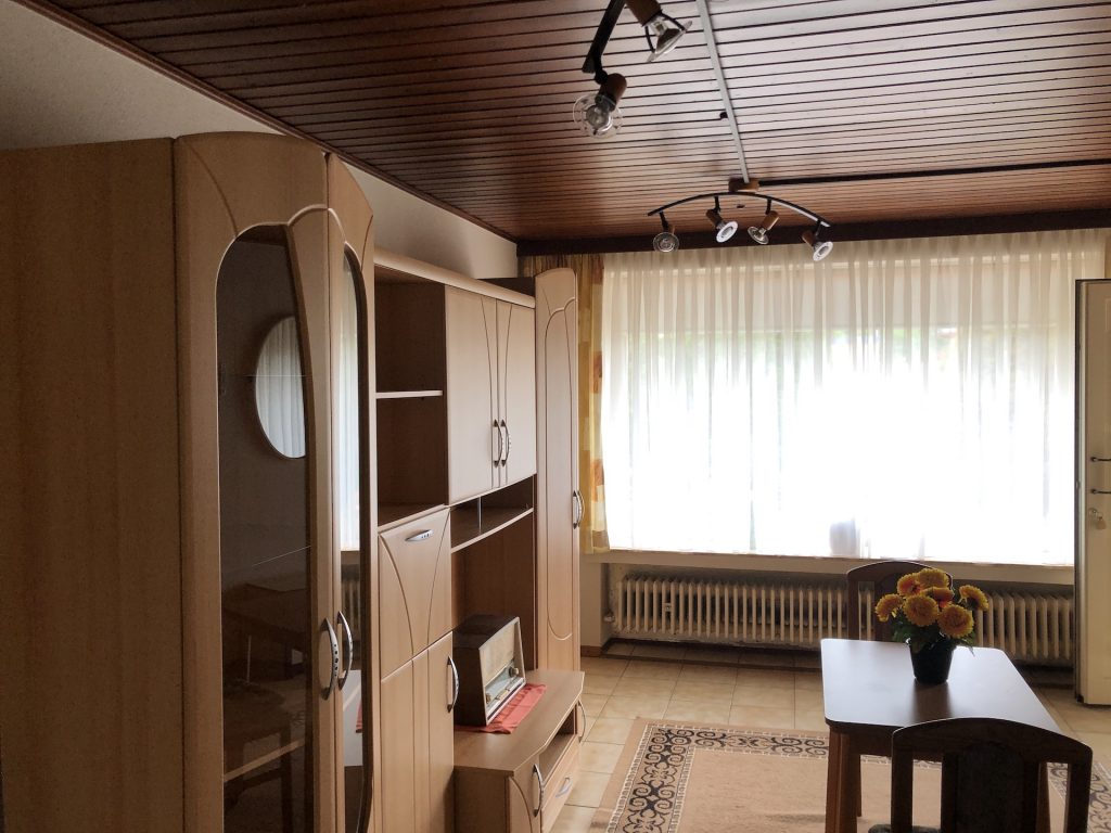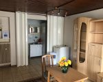 Il contient un living avec une table et 2 chaises, une grande armoire, une petite commode, des rideaux, des radiateurs, un miroir et un frigo.